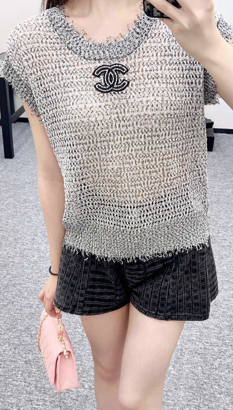 This chic and stylish Women's Designer Inspired Sheer Top adds a touch of luxury to any outfit. Created with inspiration from the iconic Chanel brand, it features sheer fabric for a delicate and sophisticated look. Elevate your wardrobe with this exclusive designer piece.