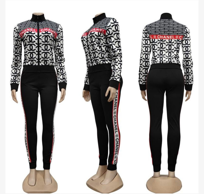 Make a statement with the Chanel Monogram Tracksuit, a blend of iconic style and modern comfort. This striking set features the timeless Chanel “CC” logo printed across the jacket, contrasted with sleek black pants highlighted by Chanel-branded side stripes. The fitted jacket with a zip-up front and the tailored pants ensure you look effortlessly chic whether you’re out for a casual day or making a bold entrance. Perfect for the fashion-forward individual who values luxury and comfort in their everyday wardrobe.