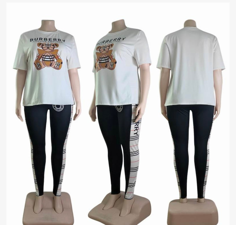 Step into comfort and style with this Burberry plus size T-shirt and leggings set, designed to flatter and celebrate every curve. The white tee features a playful Burberry bear graphic with the iconic London England branding, offering a fun twist on a classic look. Paired with sleek black leggings that showcase a side stripe with Burberry’s signature check pattern, this set is perfect for both casual wear and making a fashion statement. The high-waisted leggings provide a snug and supportive fit, while the soft cotton blend of the T-shirt ensures all-day comfort. This set embodies Burberry’s commitment to inclusive fashion without compromising on luxury. Ideal for everyday wear or relaxed weekends, it’s a must-have addition to your plus-size wardrobe.